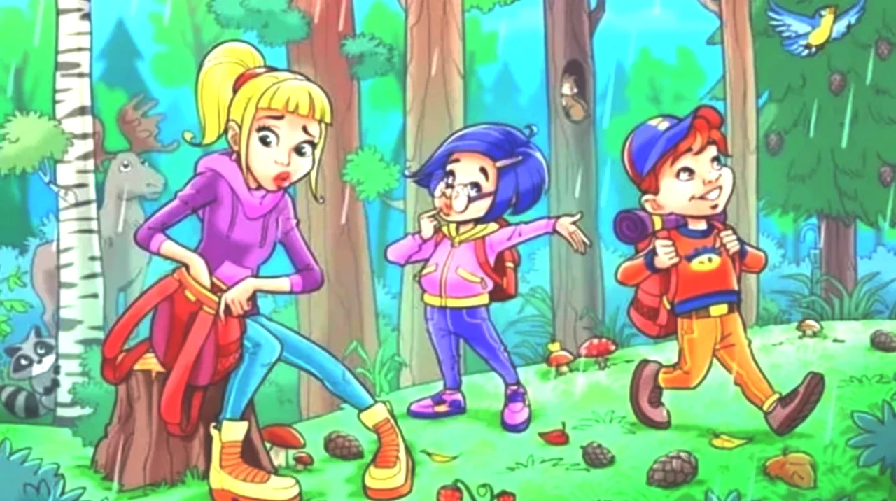 Şiddetli bir yağmur yağarken, orman gezisinde bulunan üç kişi bir şemsiye bulmaya çalışarak ıslanmaktan korunmaya çalışıyorlar.